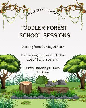 Exciting News: 'Forest School Driffield' is starting. Set in an orchard on Beverley Road in Driffield, Jen - one of the Forest Quest Team - is running weekly sessions for toddlers and their parents. Initially she is running 6 sessions but if successful is aiming to expand the offering. Message us for more info, or go to: Forest Quest Driffield Facebook.
